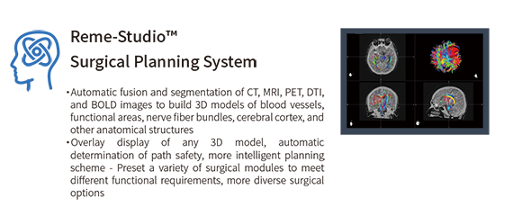 Q:What features does the Reme? surgical planninA:The surgical planning software can achieve multimodal image fusion including CT, MRI, PET, DTI, etc., multiple tissue segmentation, and advanced image processing functions to meet the various needs of neurosurgical image processing and surgical planning.