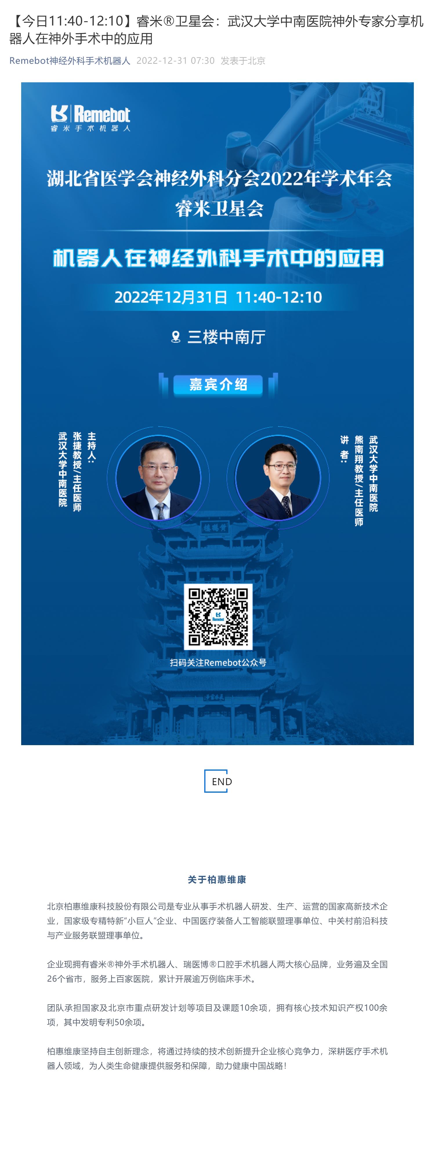【今日11:40-12:10】睿米?衛(wèi)星會(huì):武漢大學(xué)中南醫(yī)院神外專家分享機(jī)器人在神外手術(shù)中的應(yīng)用